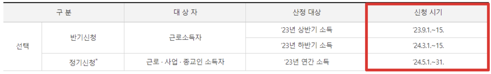근로소득만 있는 자는 반기신청과 정기신청을 선택하여 신청할 수 있고, 사업 또는 종교인 소득이 있는 자는 정기신청만 가능합니다.