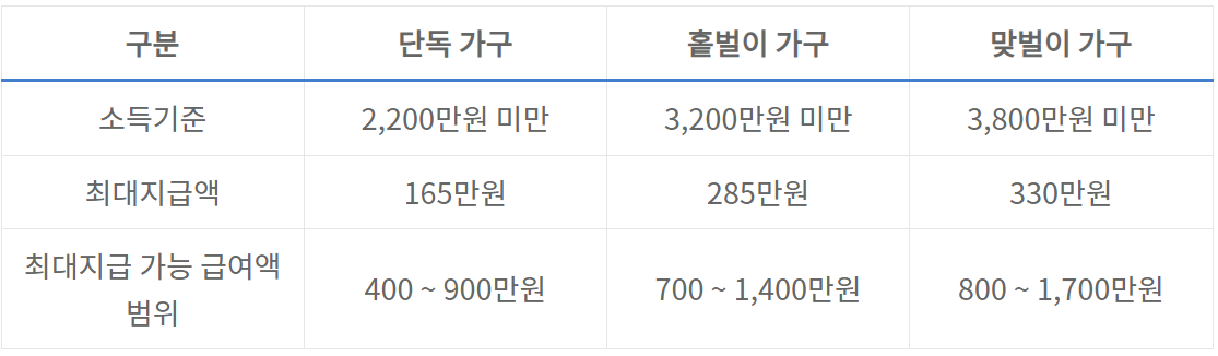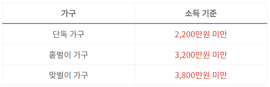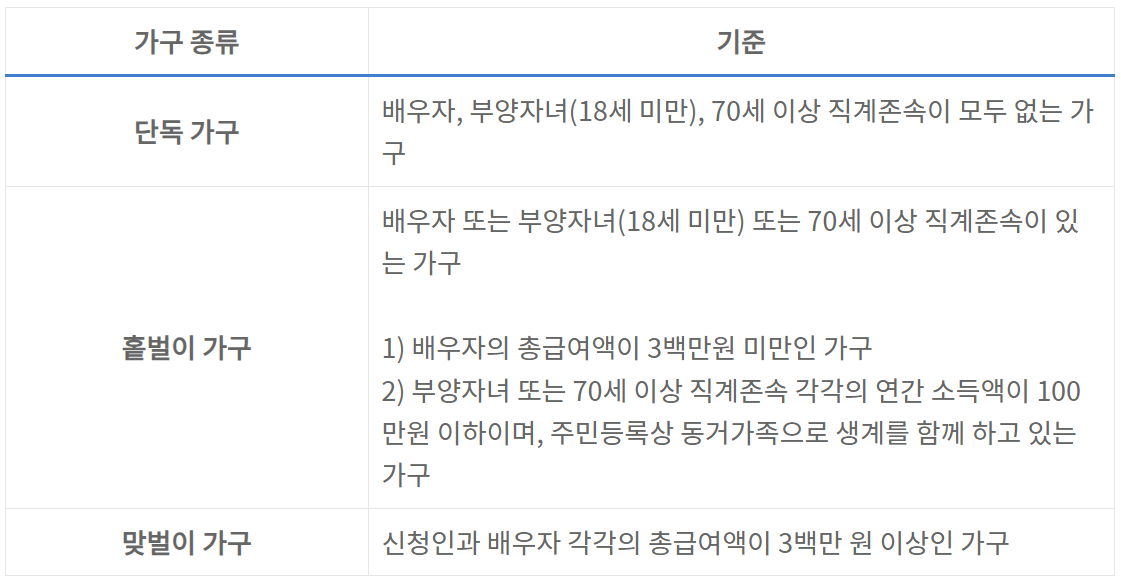※홑벌이 가구 : 배우자 소득이 전혀 없거나, 소득이 있더라도 연간 300만 원 미만이라면 인정됩니다.