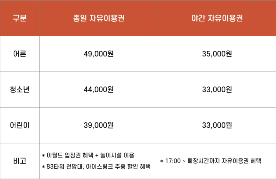 이월드의 입장료는 종일 자유이용권관 야간 자유이용권으로 나뉩니다.