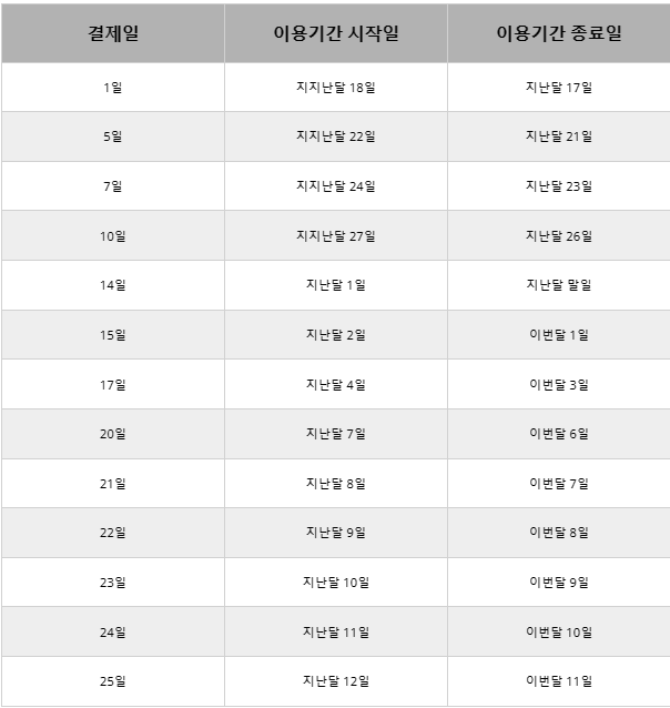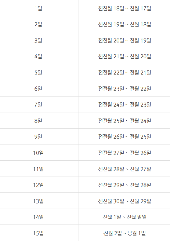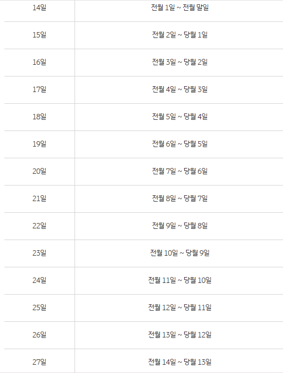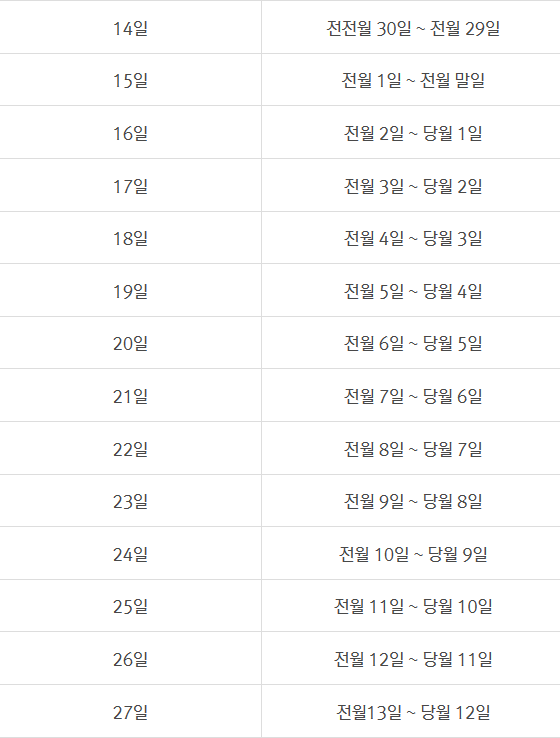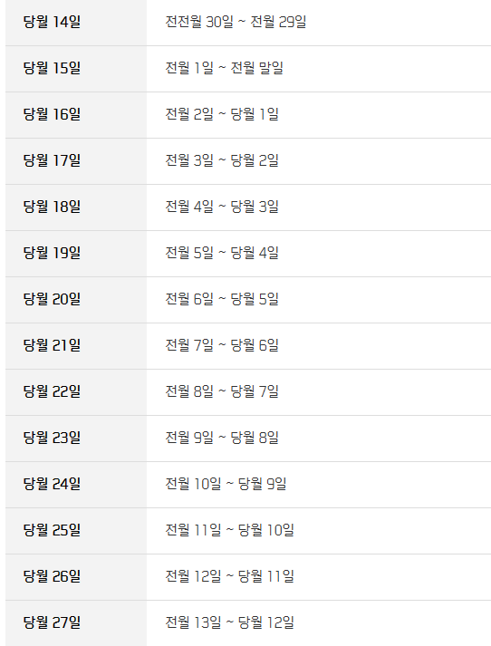 위의 추천 결제일은 카드 이용기간이 매월1일부터 말일까지의 사용금액을 결제하는 날입니다. 이렇게 했을 때의 장점은 카드사별 전월실적 계산이 쉬워서 카드사 혜택을 챙기기가 쉽습니다.
