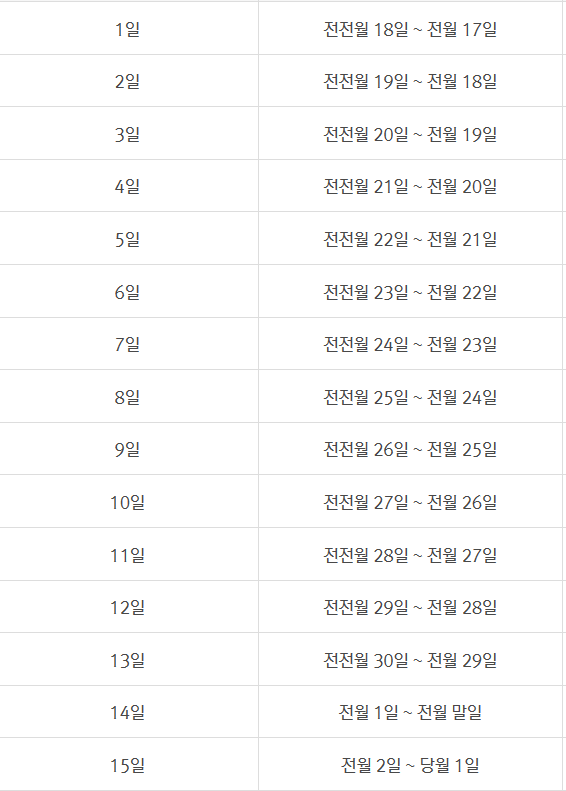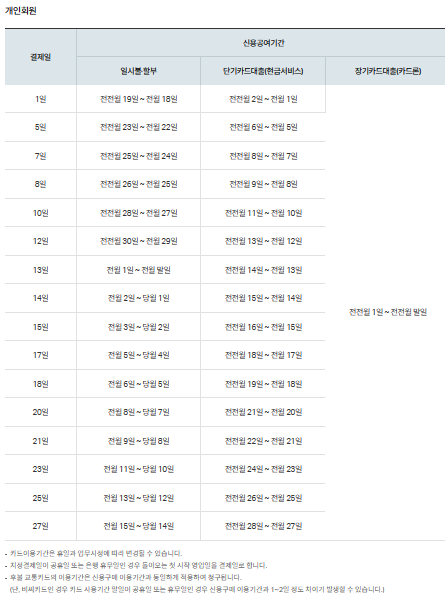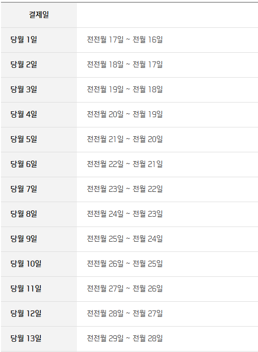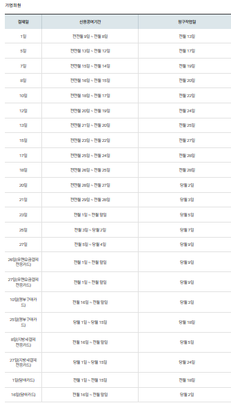 | 현대카드 | 12일 | 비씨카드 | 12일 15일 |