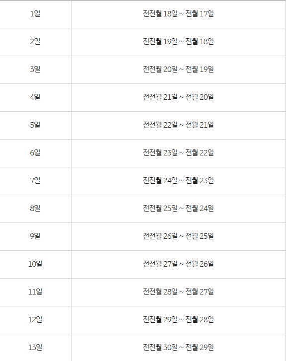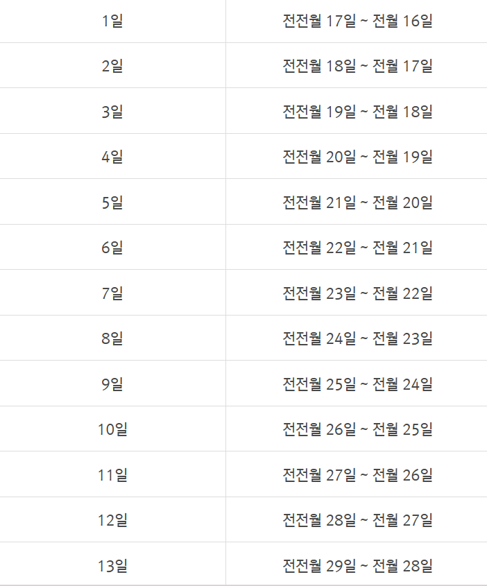 | 삼성카드 | 13일 14일 | 하나카드 | 13일 |