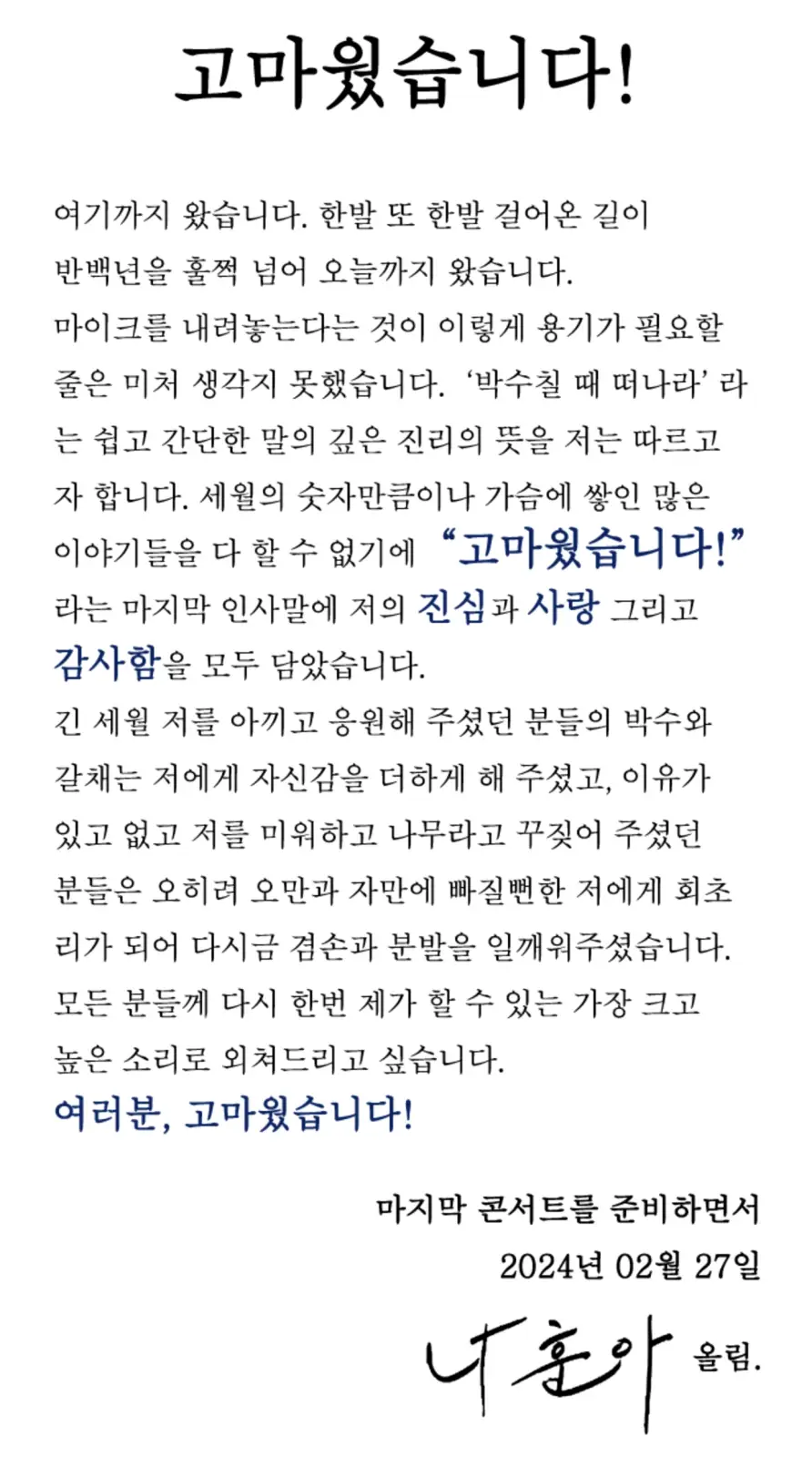 '땡벌', '고향역', '잡초' 등 수많은 히트곡을 남긴 가수 나훈아가 이번 콘서트를 마지막으로 은퇴를 예고했습니다. 데뷔 58년차인 가수 나훈아는 "박수칠 때 떠나라는 쉽고 간단한 말의 깊은 진리의 뜻을 저는 따르고자 합니다"라는 내용의 편지를 전하였는데요. 이 편지로 미루어보아 2024 나훈아 콘서트가 아마 마지막 콘서트가 되지 않을까 싶습니다.