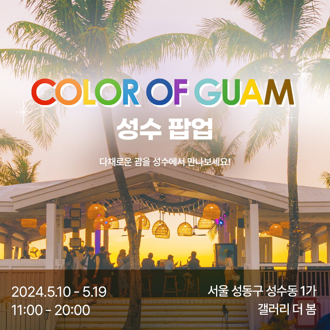 괌정부관광청은 글로벌 캠페인 컬러 오브 괌의 일환으로 2030세대에 괌의 다채로운 매력을 알리기 위해 기획되었습니다. 괌의 해변 바(bar)를 옮겨놓은 듯한 팝업 스토어는 괌의 자연과 문화를 체험할 수 있는 공간으로 꾸며졌습니다. 옜 차모로인의 삶을 엿볼 수 있는 사진과 공예품을 전시하고, 에메랄드빛 바다와 해 질 녘 노을로 붉게 물든 해변, 별이 가득한 밤하늘을 미디어 아트로 체험할 수 있는 공간을 마련했습니다. 방문객들은 퀴즈도 풀 수 있고, 괌생네컷 사진도 촬영할 수 있습니다.