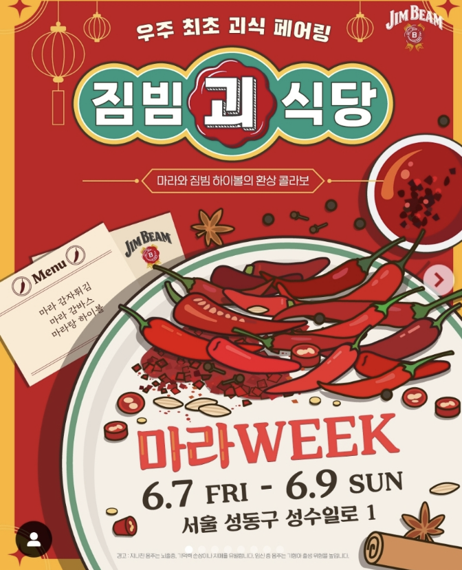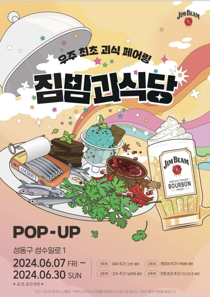 즐겨봐, 우리 괴식대로! 6월 한 달 금토일 듣도보도 못한 짐빔괴식당 성수 팝업이 열립니다. 짐빔 괴식당은 주찹려로 특색있는 식재료를 활용하여 유명 셰프들의 특별한 괴식과 짐빔 하이볼을 선보입니다.