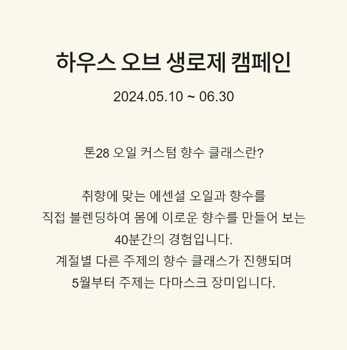 톤28 생로제를 경험할 수 있는 공간이자 생장미가 가득한 공간이라 예쁜 사진도 찍을 수 있고, 방문 시 젤라또 아이스크램도 무료입니다. 방문 후에 플러스친구 추가와 선물하기 찜하기를 하면 생로제 큐티클 오일도 증정합니다. 추가로 톤28 오일 커스텀 향수 클래스도 진행중이라 7만원 이상 결제한 고객과 동반 1인에게 체험기회를 드립니다.