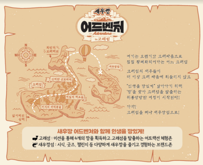오랜 기간 고래싸움으로 점점 황폐화되어가는 어느 고래섬에서 새우들이 더 이상 고래 싸움에 휘둘리지 않고 "인생을 깡있게" 살아가기 위해 "깡"을 찾아 고래섬을 탈출하는 새우들의 위풍당당한 여정을 컨셉으로 이루어지는 팝업스토어입니다. 고래섬을 떠나 새우깡섬으로 가는 새우들의 여정에 함께하세요!