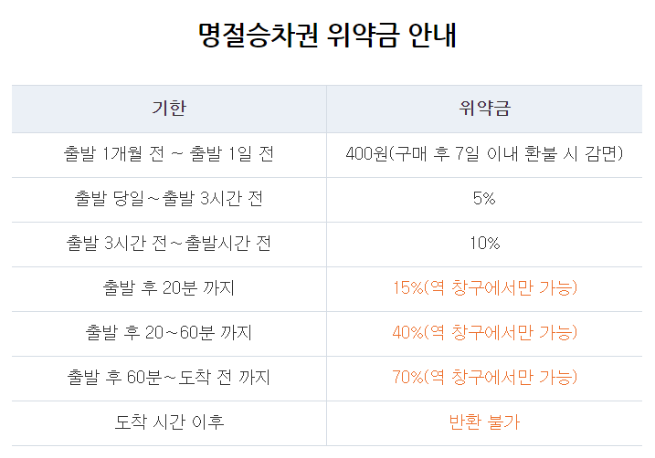 승차권 취소는 출발 시간 기점으로 위약금이 발생합니다. 명절에 기차 수요가 많은 것을 이용하여 표를 무작위로 구매하였다가 열차시간이 가까워질 때 환불하여 다른 이용객들의 열차 이용을 방해하는 사람들을 방지하기 위함인데요. 자세한 사항은 아래 표를 참고하시길 바랍니다.
