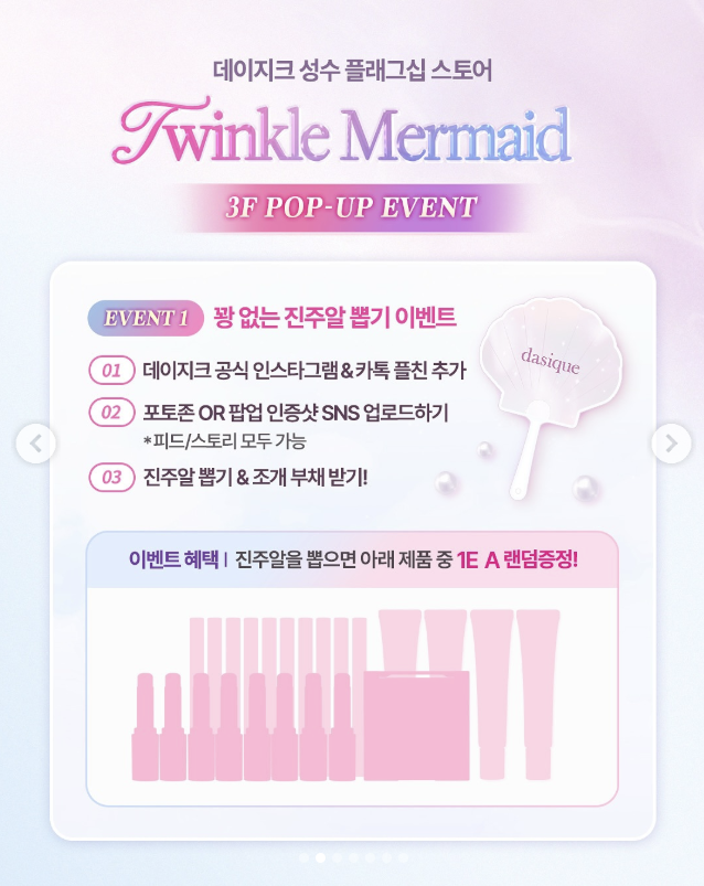3F 트윙클 머메이드 팝업에서는 웜/쿨 럭키 박스부터 꽝 없는 진주알 뽑기 이벤트까지 준비되어 있으니, 7/31(목)까지 성수에서 만나요!