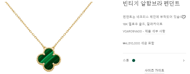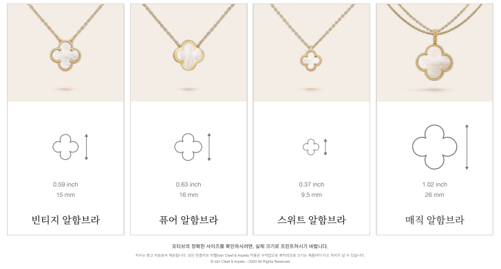스위트 알함브라 < 빈티지 알함브라 < 퓨어 알함브라 < 매직 알함브라 순으로 크기가 커지고 그 중에서 가장 인기가 많은 라인은 너무 작지도, 크지도 않은 빈티지 사이즈입니다. 하지만 데일리로 사용할만한 작은 크기의 목걸이를 원하는 사람을은 스위트 사이즈 또한 많이 찾습니다.