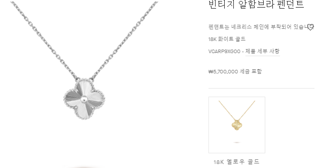 빈티지 알함브라는 팬던트별로 가격이 조금씩 다릅니다. 391만원부터 시작이고 색상에 따라 가격이 올라가며, 기요세 라인이 아무래도 금이기 때문에 비싼 편이며 그 중에서도 화이트골드가 가장 비싼 걸 확인할 수 있습니다. 가격은 시간이 지나면 계속 오르니 참고만 해주세요!