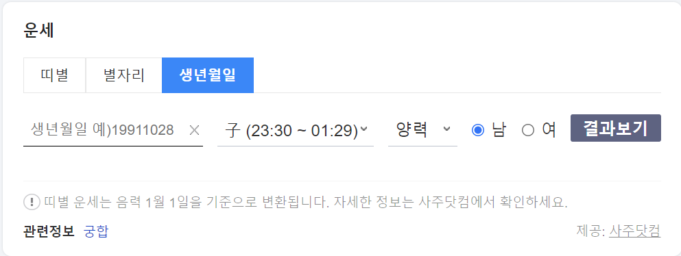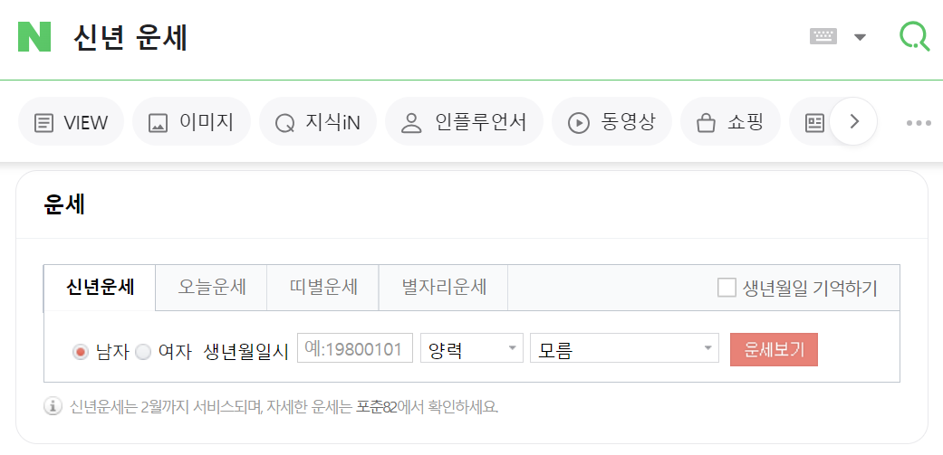 네이버 검색창에 신년 운세를 검색하시면 신년 운세 뿐만 아니라 오늘운세, 띠별운세, 별자리운세를 알려주는 서비스를 제공합니다. 신년운세의 경우, 성별과 생년월일시만 알면 간단하게 확인할 수 있으니 네이버 운세 서비스를 통해 올해의 신년운세를 보고 한 해를 어떻게 보낼지 고민해보시길 바랍니다.