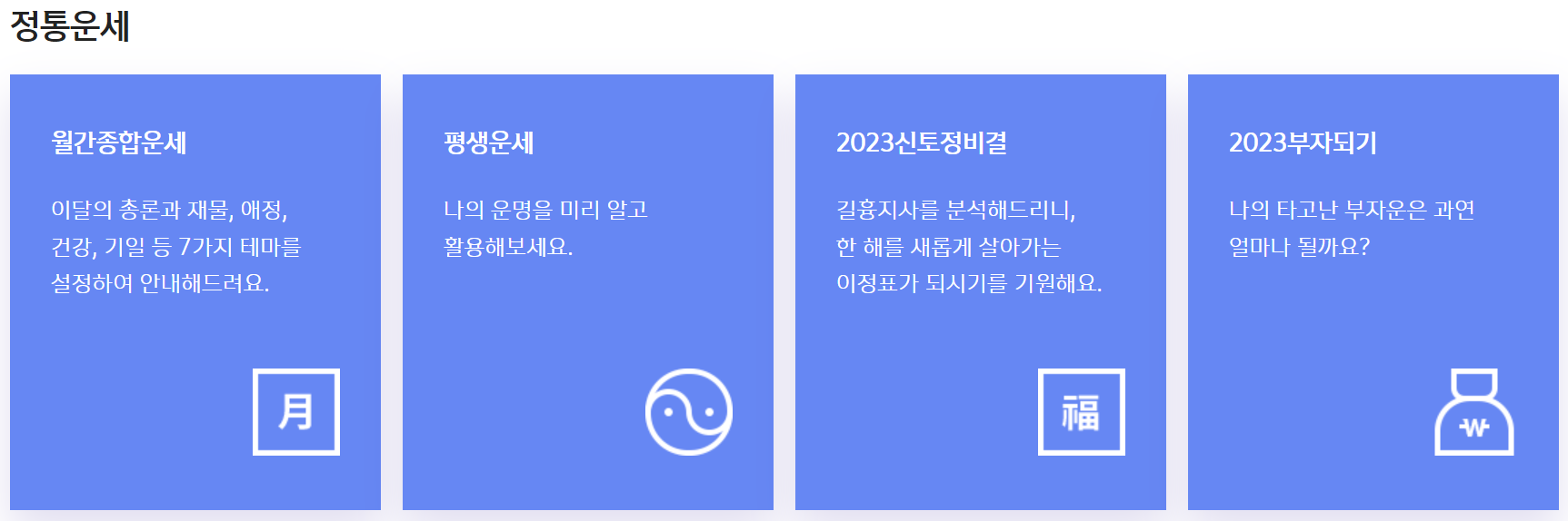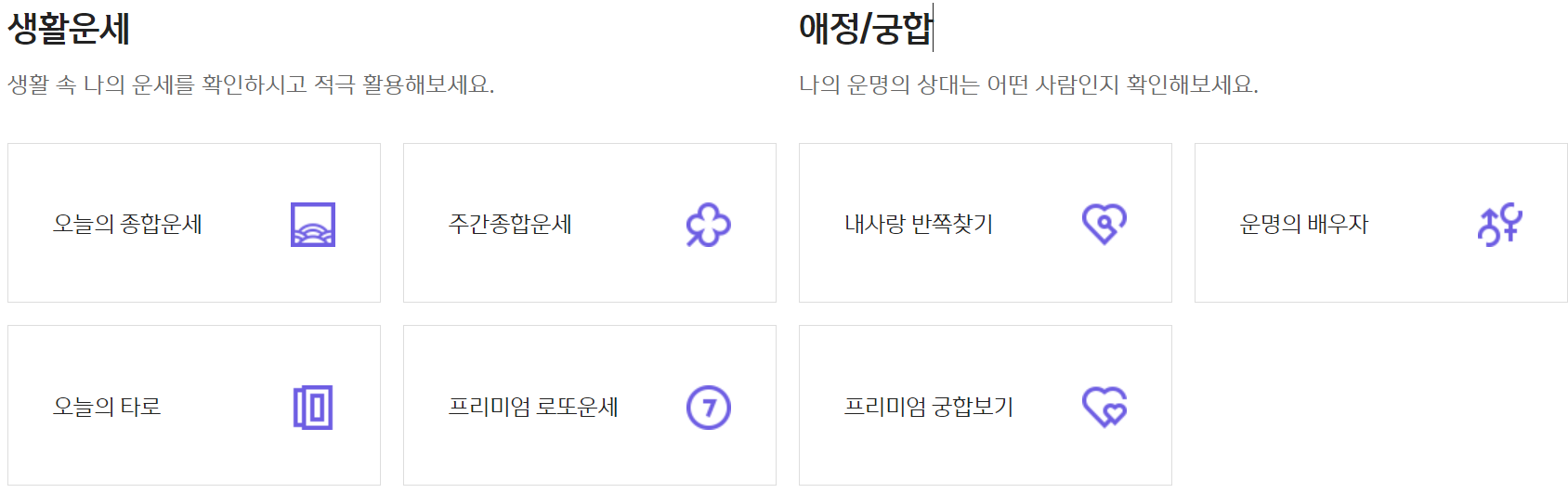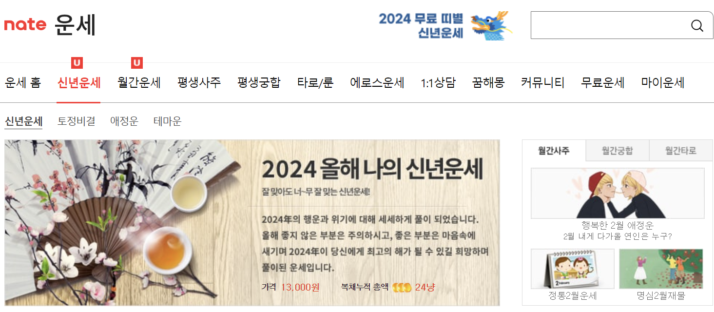 네이트의 경우 다른 사이트들에 비해 좀 더 구체적으로 운세 서비스를 제공합니다. 네이트 운세 사이트를 접속해서 신년운세뿐만 아니라 월간운세, 사주 ,궁합, 타로, 꿈해몽 등 다양한 운세를 확인해볼 수 있으며 좀 더 구체적이고 개인적인 운세가 궁금하다면 1대1 상담도 제공하고 있으니 많이 이용해보시길 바랍니다.