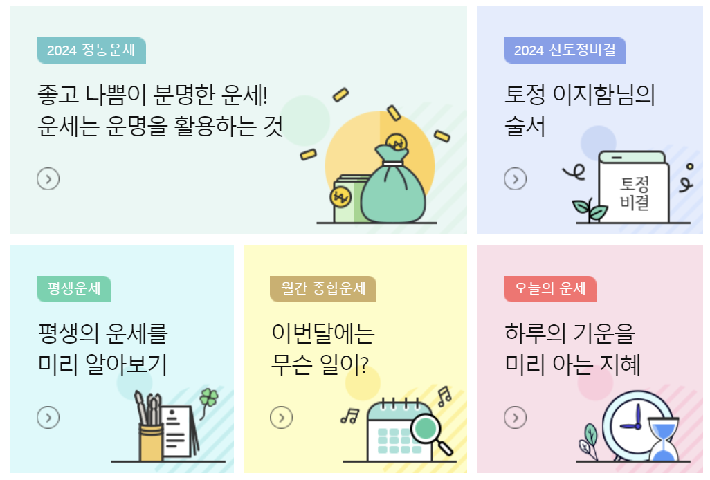 농협은행 뿐만 아니라 신한에서도 운세서비스를 제공합니다. 금융기관이다보니 신년운세를 비롯하여 부자운이라 로또운세도 제공하고 있으니 2024년 금전운이 궁금하신분들은 신한라이프에서 운세를 확인해도 좋을 것 같습니다.