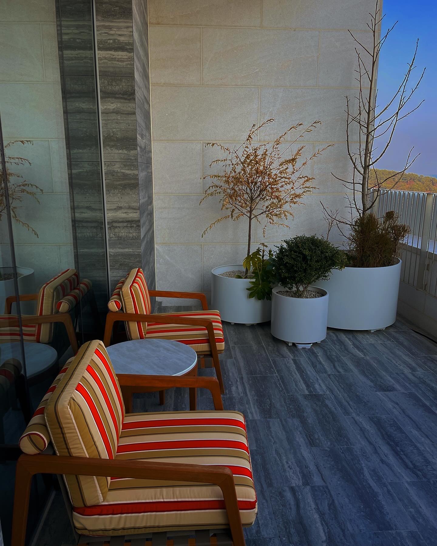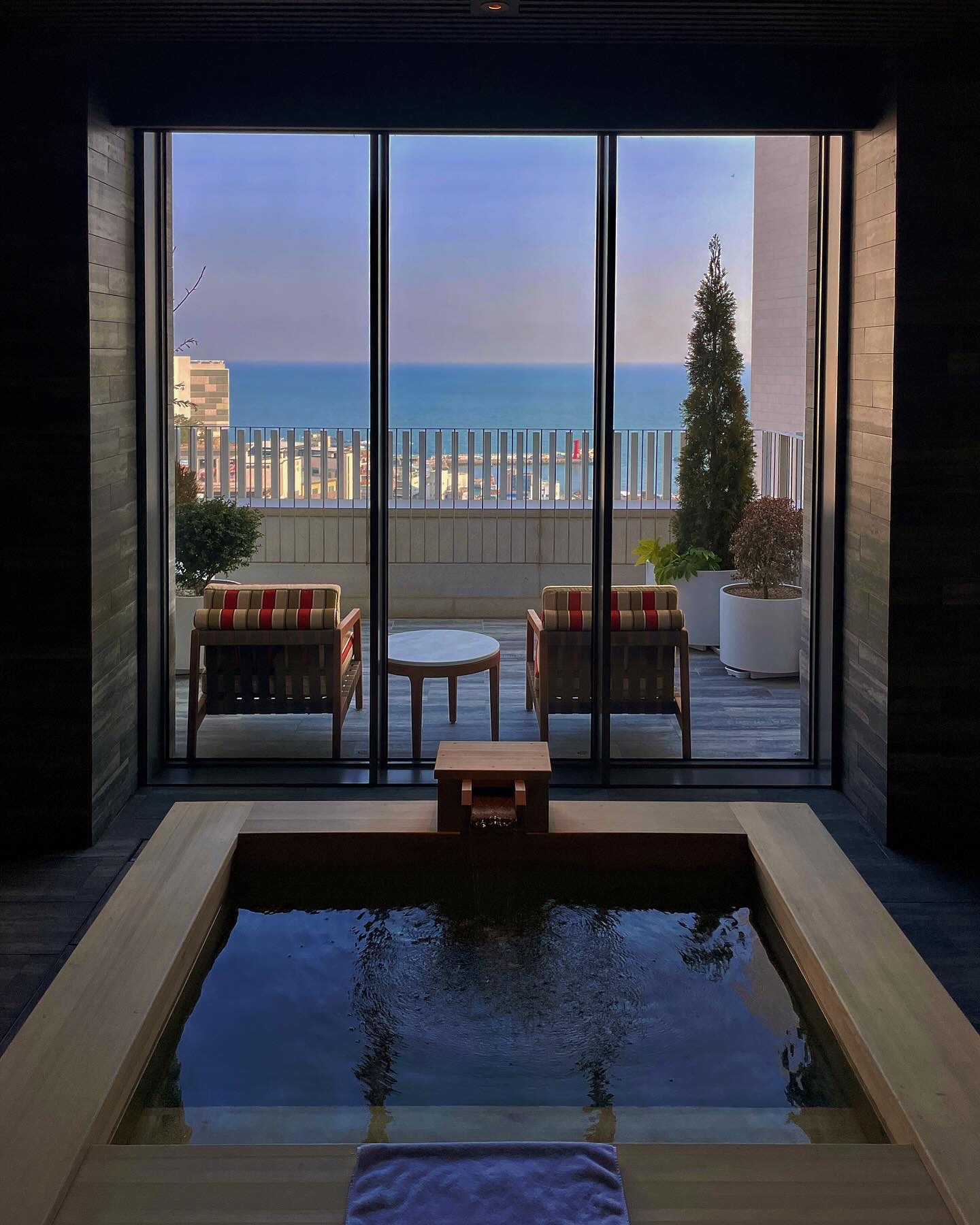 자쿠지 옆에는 선베드가 2개 있고 선베드 앞은 발코니로 나가는 문, 뒤로는 욕실로 가는 문이 있습니다.