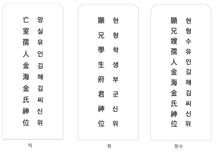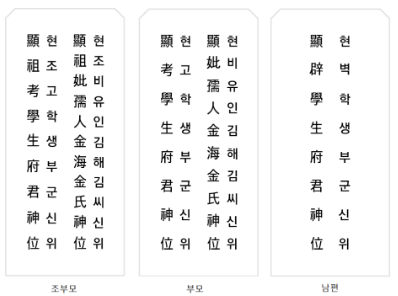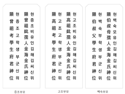 고인과 제사를 모시는 사람(제주)와의 관계를 적고, 고인의 직위와 이름을 적은 후 마지막에 신위라고 적습니다.